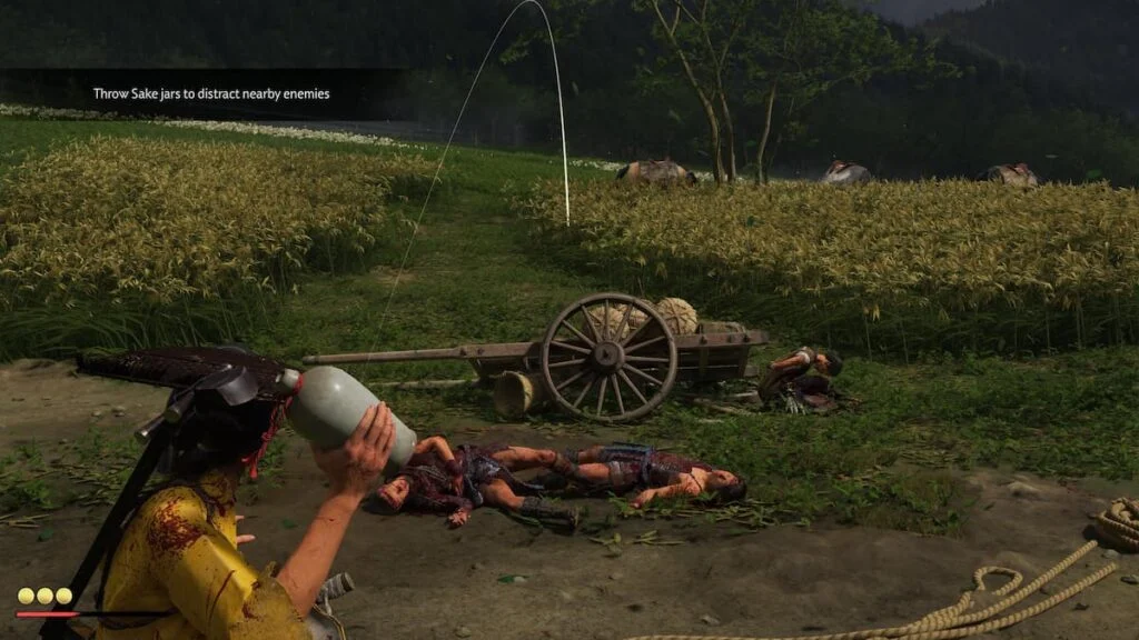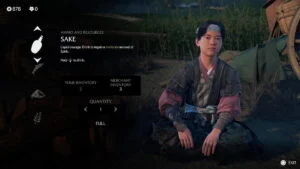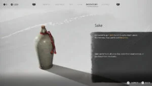日本酒は、戦闘に大きく影響しませんが、短期間のアツのビジョンをわずかに曖昧にします。キャンプの攻撃の準備をしている場合は、早めに飲んで、効果が消えるのを待ちます。日本酒を終えた後、空の酒瓶を受け取ります。これは、敵をそらすか、ステルスキルのために背の高い草に描くのに便利です。