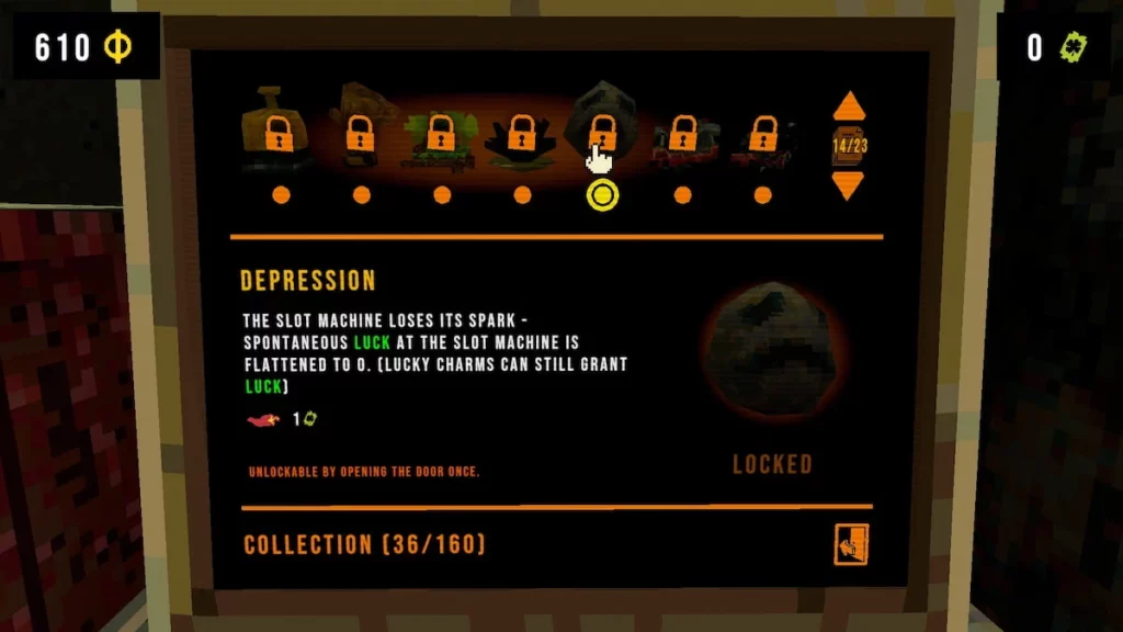 ドアを開けて少なくとも一度は逃げた後、うつ病チャームのロックが解除されます。脱出とはゲームを完了することを意味し、4つの引き出しすべてのロックを解除して、最終キーのために十分なコインを獲得する前に、4つの死体と頭蓋骨を獲得する必要があるため、かなりの粉砕が必要です(秘密の終わりを遂行しようとしない限り、プロセスにはいくつかの追加の条件があります)。