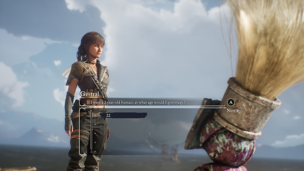 コースを修了したら、Gestralに近づき、Gustaveの水着を提供します。ただし、ストーリーのどこにいるかによって、報酬は異なる場合があります。それから彼らはあなたに尋ねます、「もし私が2歳の人間だったら、私は何歳でゴメージになりますか?」方程式を自由に解決できますが、どんな答えでも十分ですGestralは実際に数学を行う方法がわからないので。しかし、あなたが本当に正解を知りたいなら、それは17であり、Paintressの柱のカウントダウンシーケンスと相関しています。