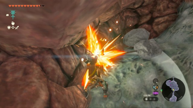 それぞれが弱い岩でブロックされたトンネルで接続されている島を通り続けます。スマッシングが必要な石の数があるため、私はあなたがクリアするまでこの領域を避けることをお勧めします火の寺院。耐久性のある青い岩でブロックされた最後のトンネルを通るトレジャーチェストプラットフォームの中心で。パラグライダーを使用してそこに降りて、プラットフォームに着地します。