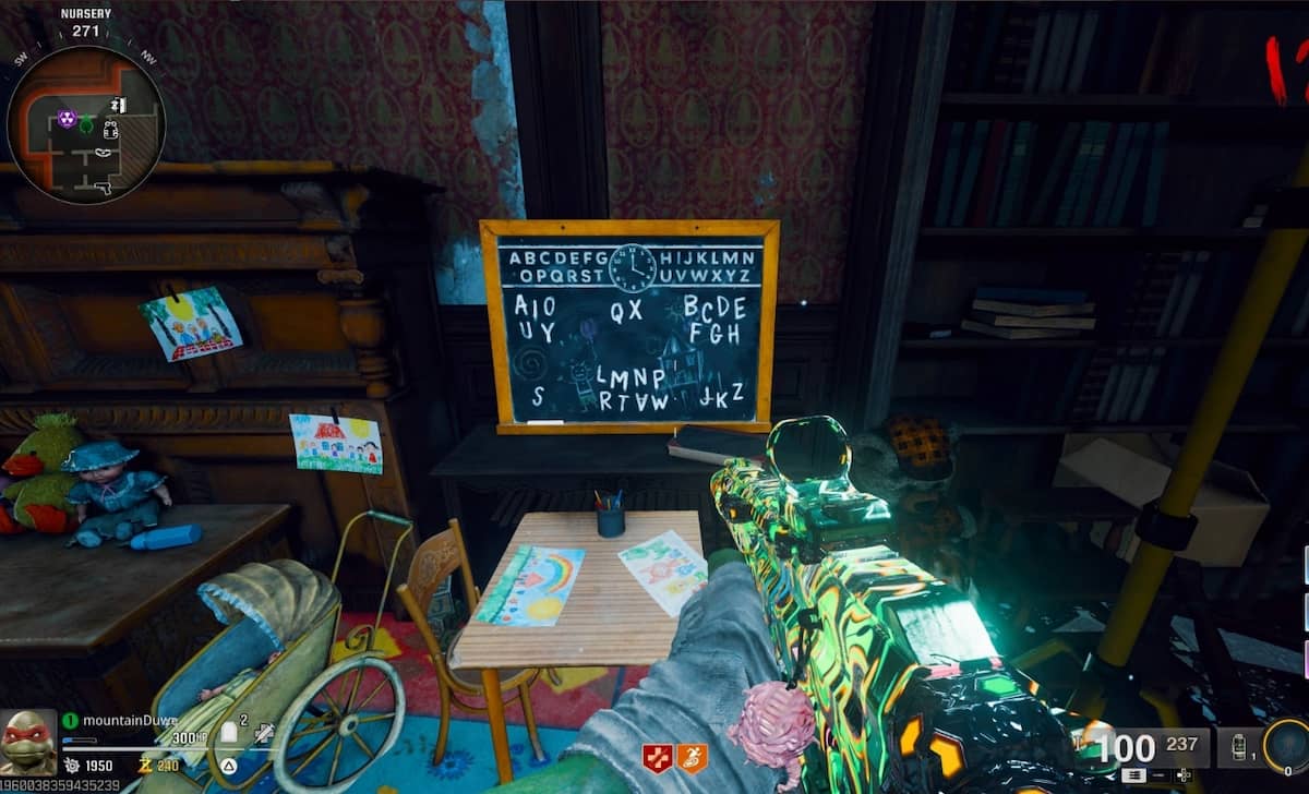 あなたのコードワードをに連れて行きます保育園部屋、大邸宅の西側博士号フロッパーの隣、そして、この黒板がそこに文字と数字が付いていることがあります。上の画像は、ファックスマシン(右側の黄色の円)と保育園の黒板(左側の黄色の円)がどこにあるかを示しています。あなたのコードワードをデコードする時が来ました。