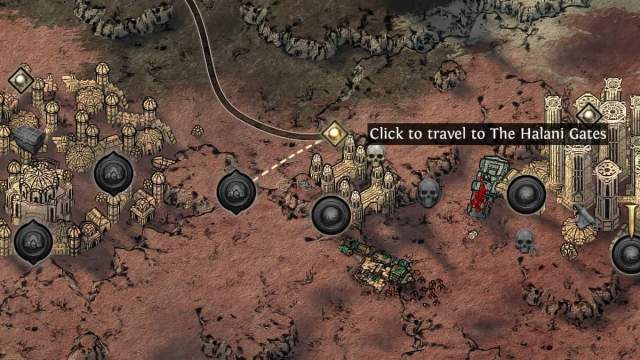 代わりに、砂漠の地図を使用してHalani Gatesに移動します。そこに着いたら、奴隷がそれを引っ張っているキャラバンの正面に移動するだけで、クエストプロンプトが表示されます。プロンプトをクリックすると、キャラクターは吹雪の角を使用して吹雪を払拭し、キャラバンが新しいエリアであるデシャルに移動する道を開いてください。