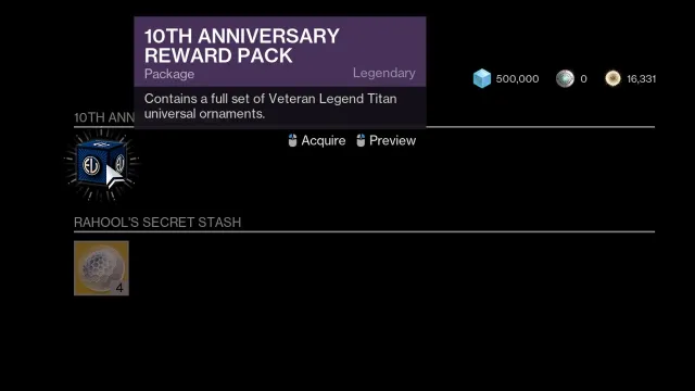 5番目と最後のCayde Stashを開いたら、タワーに近づきます特別配達 ターミナルRahoolの後ろ。主張します10周年記念報酬パック、在庫を入力して開き、完全なものを受け取ります10周年記念飾りクラスに向けて設定してください!