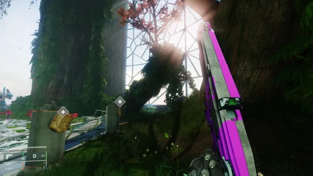 上の隠し場所から反対側に向かい、ポストボックスの後ろの領域に向かいます。飛び上がるか、階段を使用して、カバルガードが立っているプラットフォームに到達する、次に保持します端まで歩く。反対側に飛び乗って、ケイドの隠し場所を見つけて10周年記念クラスアイテム。