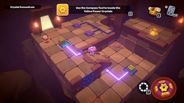 低いエリアに向かい、他の黄色の箱別のティールスイッチに座っています。それを階段を上げて、どちらかに置きますライトパープルスイッチ。最後に、をつかみます最初の黄色の箱階段のそばのティールスイッチから、その他のライトパープルスイッチドアを開けると2番目の黄色のパワークリスタルを取得します。