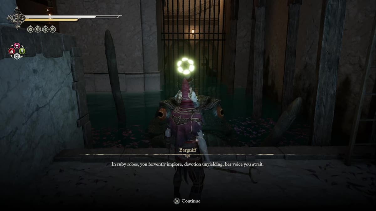 Bargniffを初めて見たのは、Litumniaの時計塔の現実の結び目の近くにいます。彼は巨大なカエルで、額にマスクがあり、頭の上から突き出ている発光の花があります。彼は広場の左側、水の端にいます。