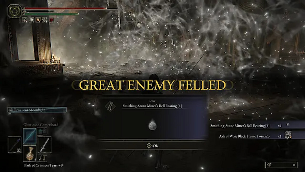 それ自体が十分に迷惑なので、最初に槍のボスを連れ出すことをお勧めします。クリスタリア人は最初に落ち着きを壊す必要があるので、カウンター攻撃は鈍いダメージの武器でうまく機能することを忘れないでください。私は、劇的に簡単で、殺すのにそれほど時間がかからない2番目のRingbladeバージョンに焦点を合わせました。このデュアルボス賞Somberstone Miner's Bell Bearing 2を破り、Somberstone 4を購入できます。