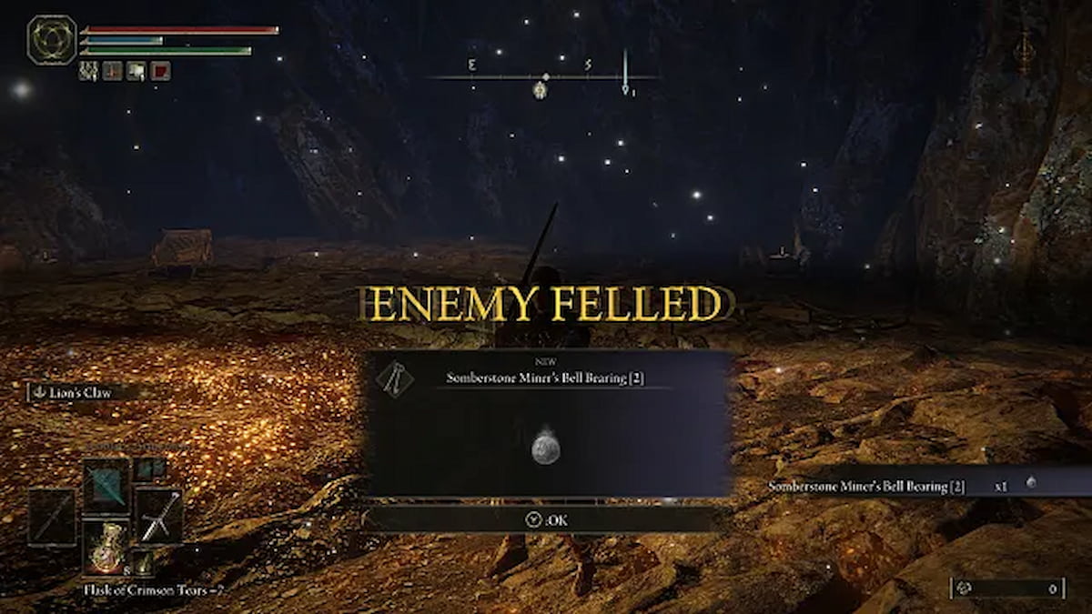 セリアの北西、魔術の町はですセリアクリスタルトンネル。その底に向かって進むと、攻撃が覆われている距離には完全に小さすぎるアリーナで、落ちる星の獣と戦うことができます。ただし、それを倒すと、Somberstone Miner's Bell Bearing 1を授与します。これにより、Somberstone 2まで購入できます。これにより、ユニークな武器を+2にアップグレードできます。