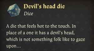 たとえば、2つの1と1つの悪魔の頭がある場合、これは3つの1とカウントされます。ただし、ダイはそれぞれに平等な確率があることに留意してください。したがって、悪魔の頭を取得することはまだ1/6のチャンスがあります。