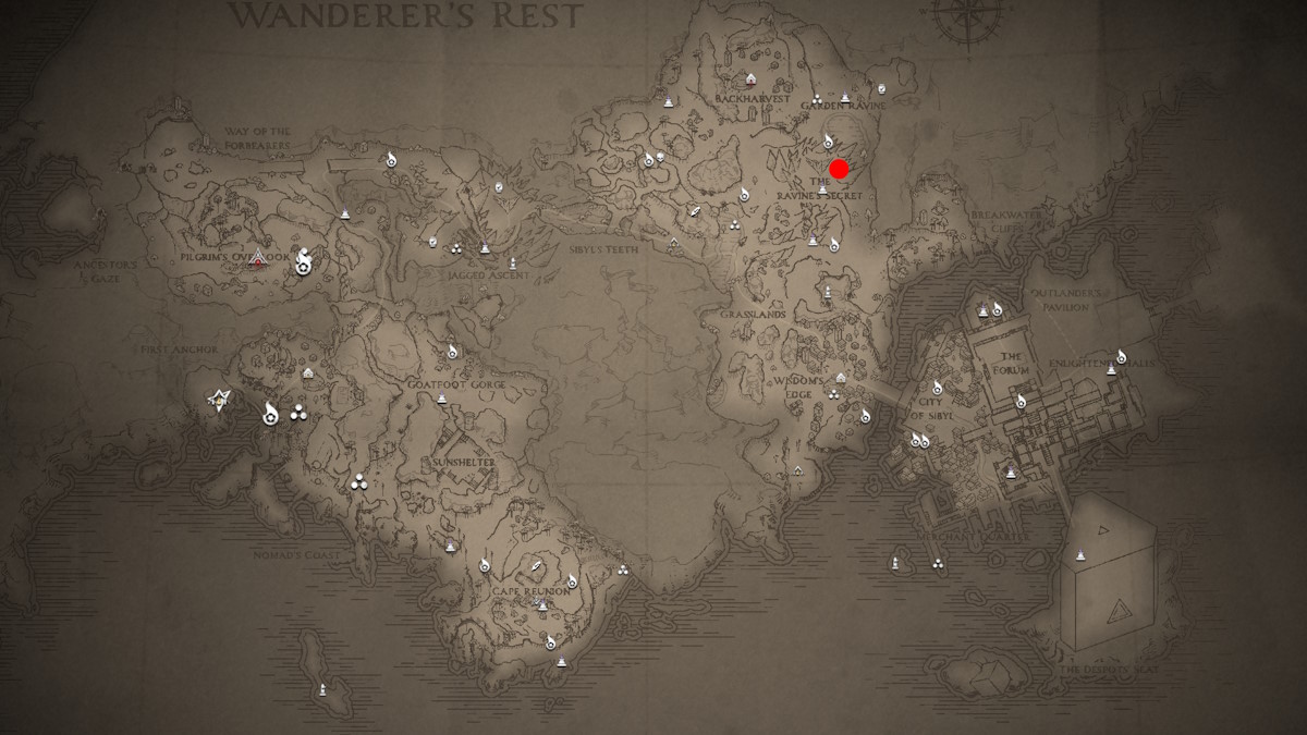 サンデラーのガントレットは、ワンダラーの休息の北東にある渓谷の秘密の胸にあります。ここでは、フリントロックの地図上にあるクリスタルで作られた巨大な場所の1つであるドーンの包囲が見つかります。これらのサイトは通常、残党が隠れている場所であり、それもここにも当てはまります。渓谷の秘密の頂上でボスの敵を倒すと、サンデラーのガントレットが見つかります。