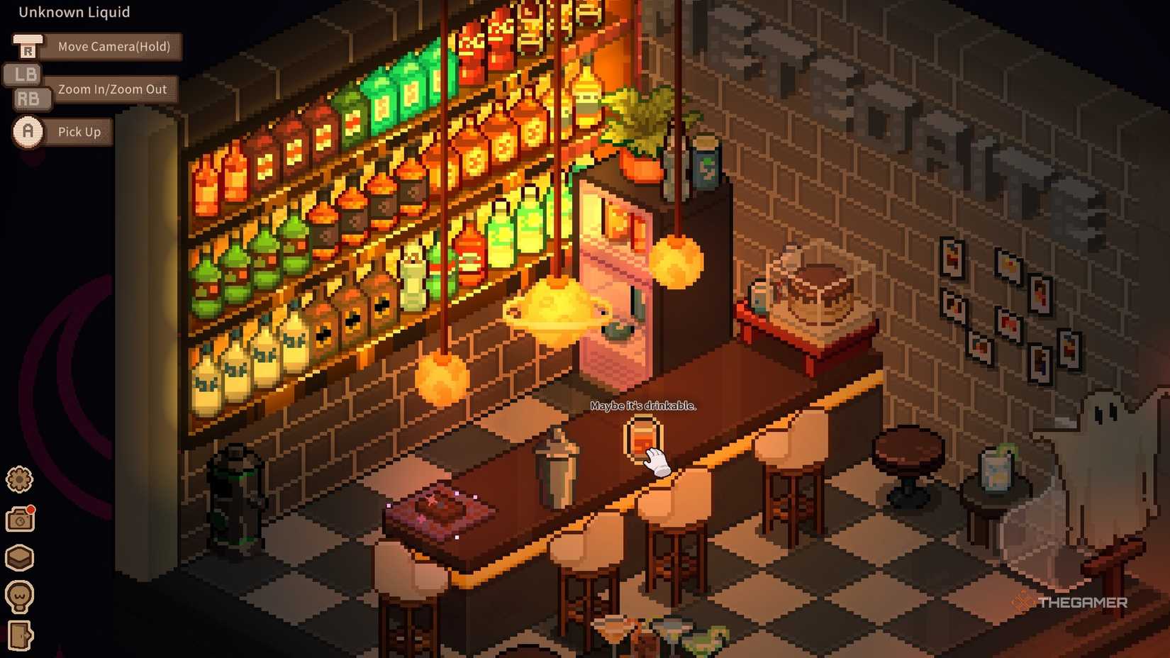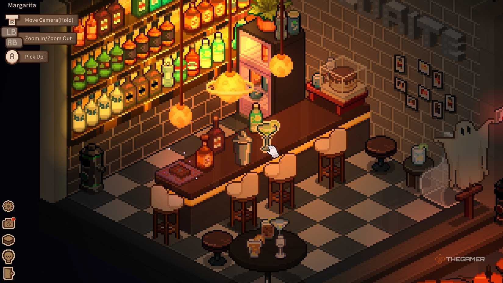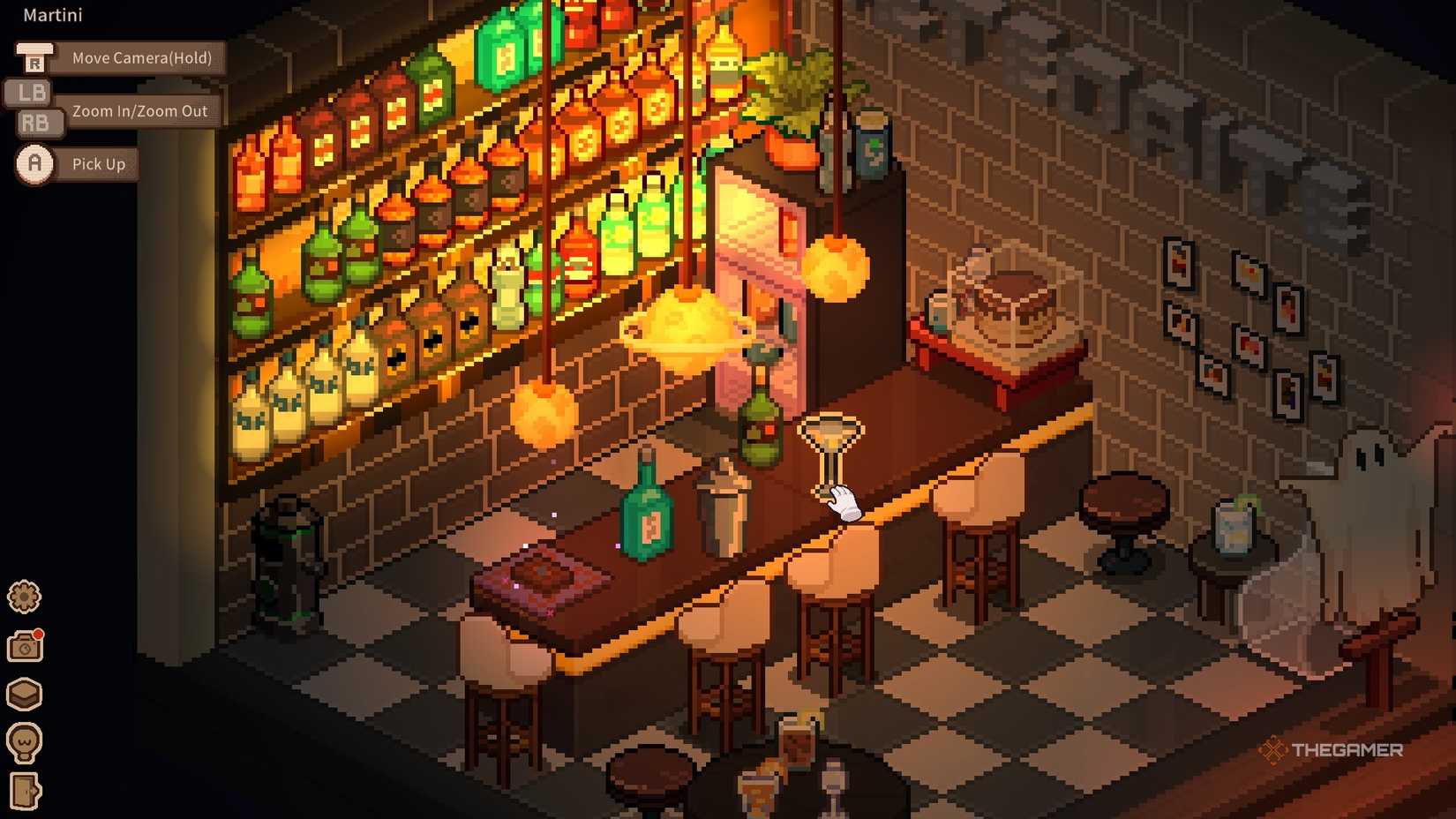 内部には、ピックアップするゴミ、戻すボトル、セットアップする楽器がいくつかあります。それがすべて完了したら、できますカクテルを作り始めます。バーにはaがありますカクテルシェーカーそしていくつかタロットカード。各カクテルを作るには、次の手順に従ってください。