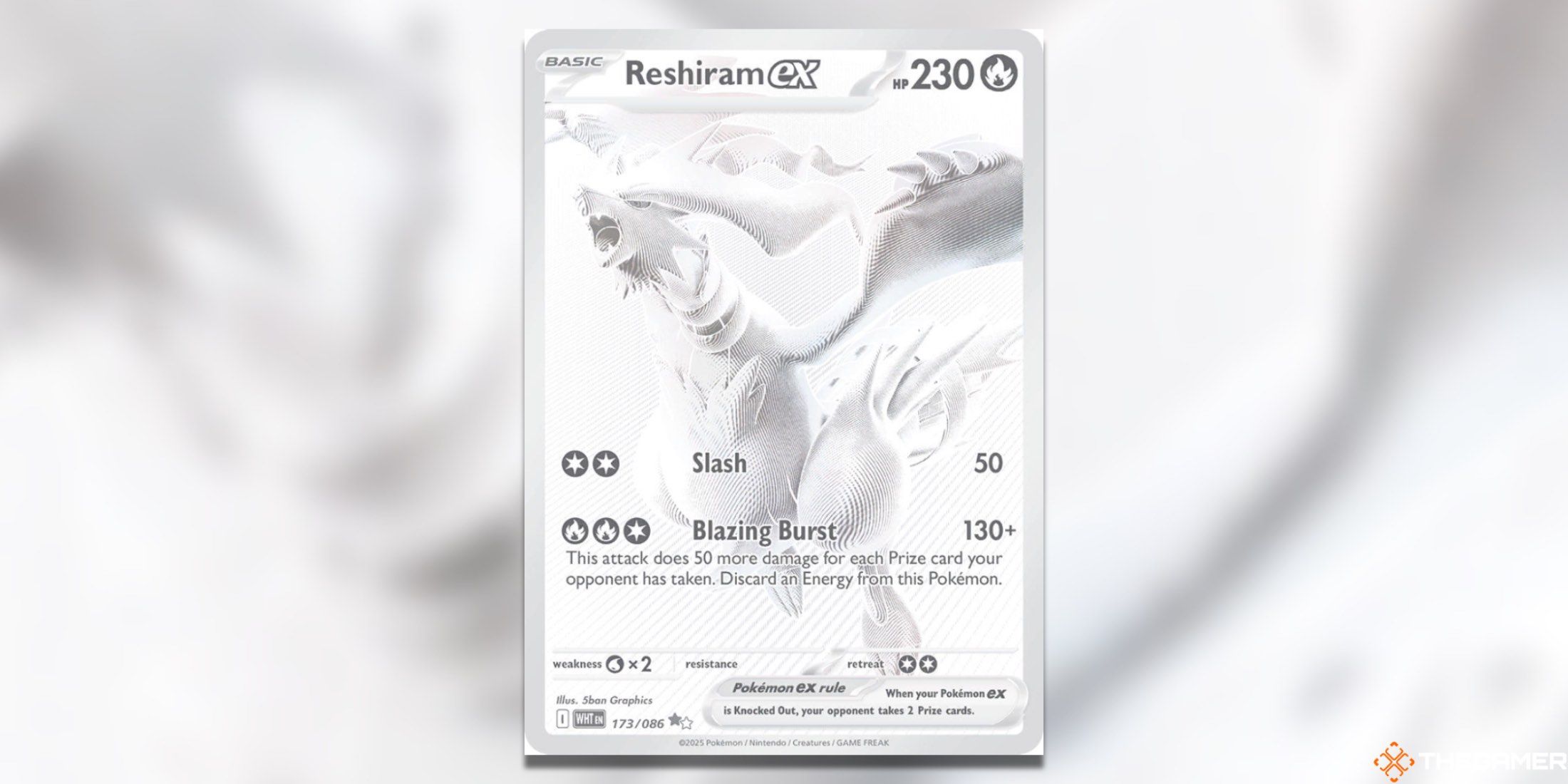 スペクトルのもう一方の端では、Reshiram exサーは、白いフレアで最も明るく視覚的に刺激的なカードの1つであり、見事な白いコートとポケモンの堂々としたデザインを強調するオレンジ色の赤い炎があります。
