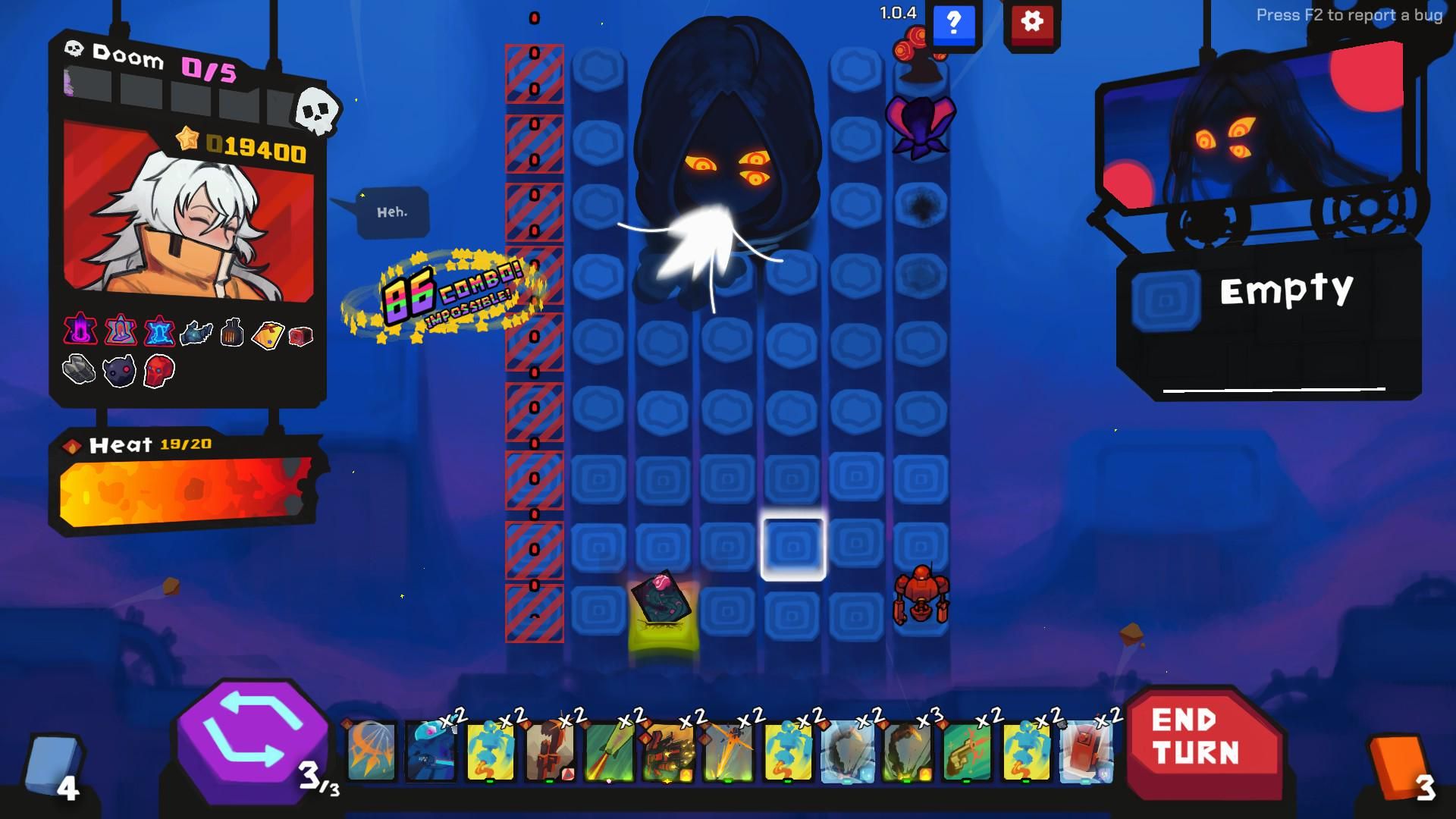 敵がグリッドの下3列に到達するたびに、それらを排除するための1回のターンがあります。そうしないと、1つのDoomのポイントを獲得します。これは、健康ポイントを失うようなものですが、後方になります。 5ポイントのDoomを取ると、走りが終了し、スタートに戻ります。