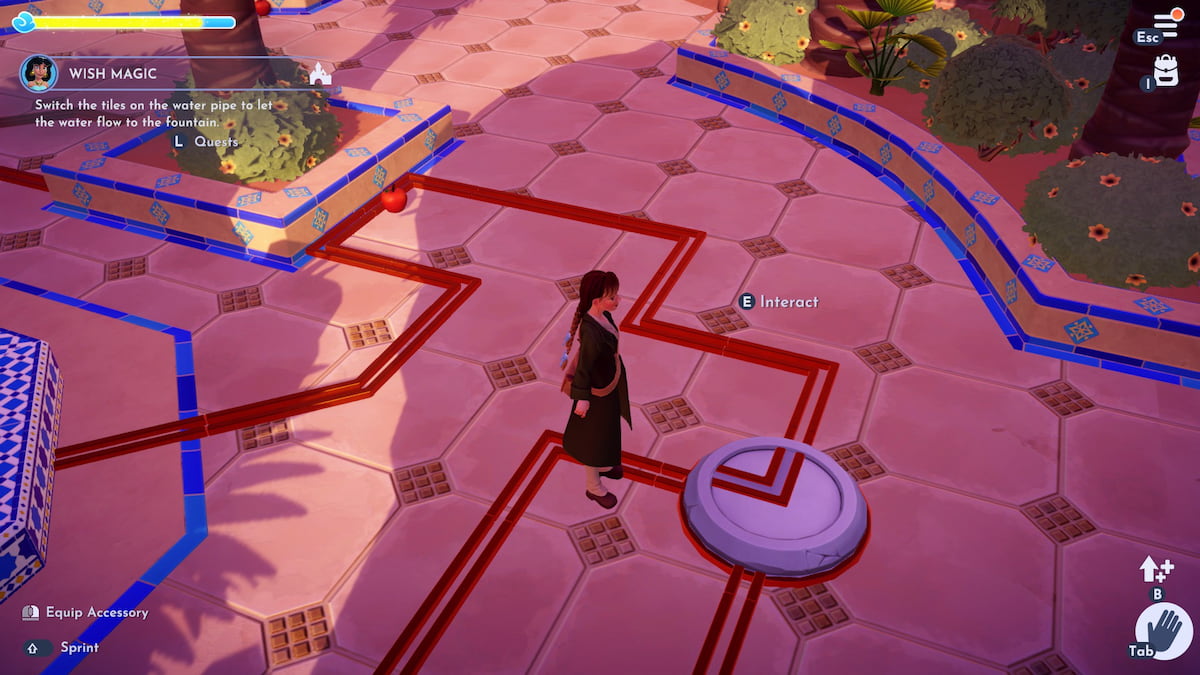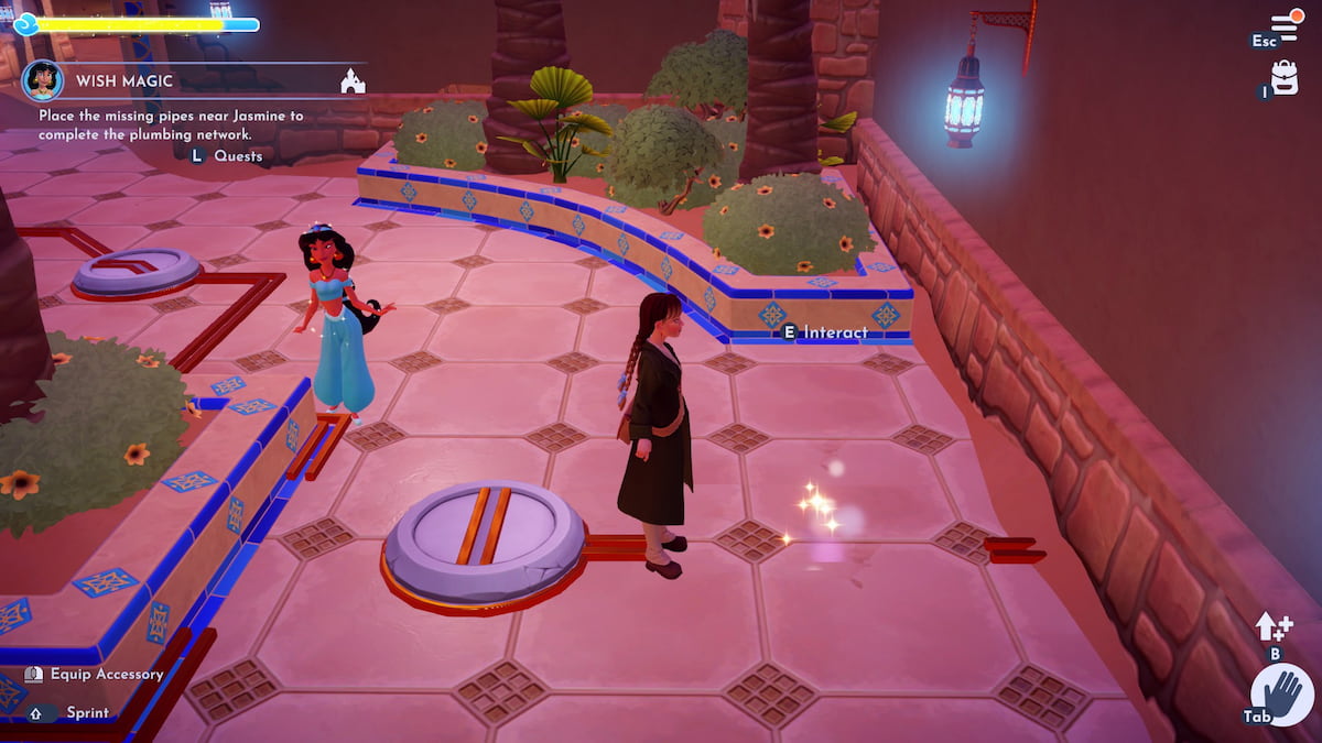 クラフトステーションから右折して、噴水のある中庭に入ります。エリアの反対側のジャスミンに向かい、と対話します きらめくスポットパイプを配置するために地面に。