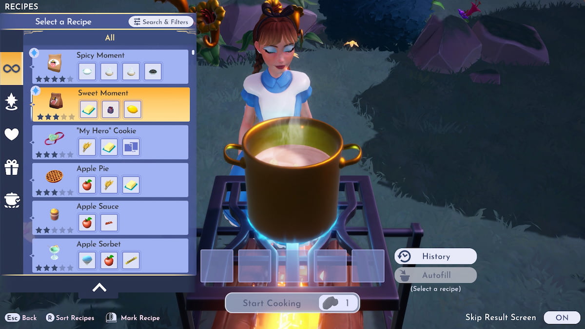 両方でスパイシーな瞬間そして甘い瞬間作られて、再びクッキングステーションとやり取りして、より多くの時間を作り始めます。また、追加する必要があります不思議な懐中時計あなたはワンダーランドの領域に入る直前につかみました。これらの3つの材料のみが必要なので、レシピを完成させるためにそれらをすべて投げてください。