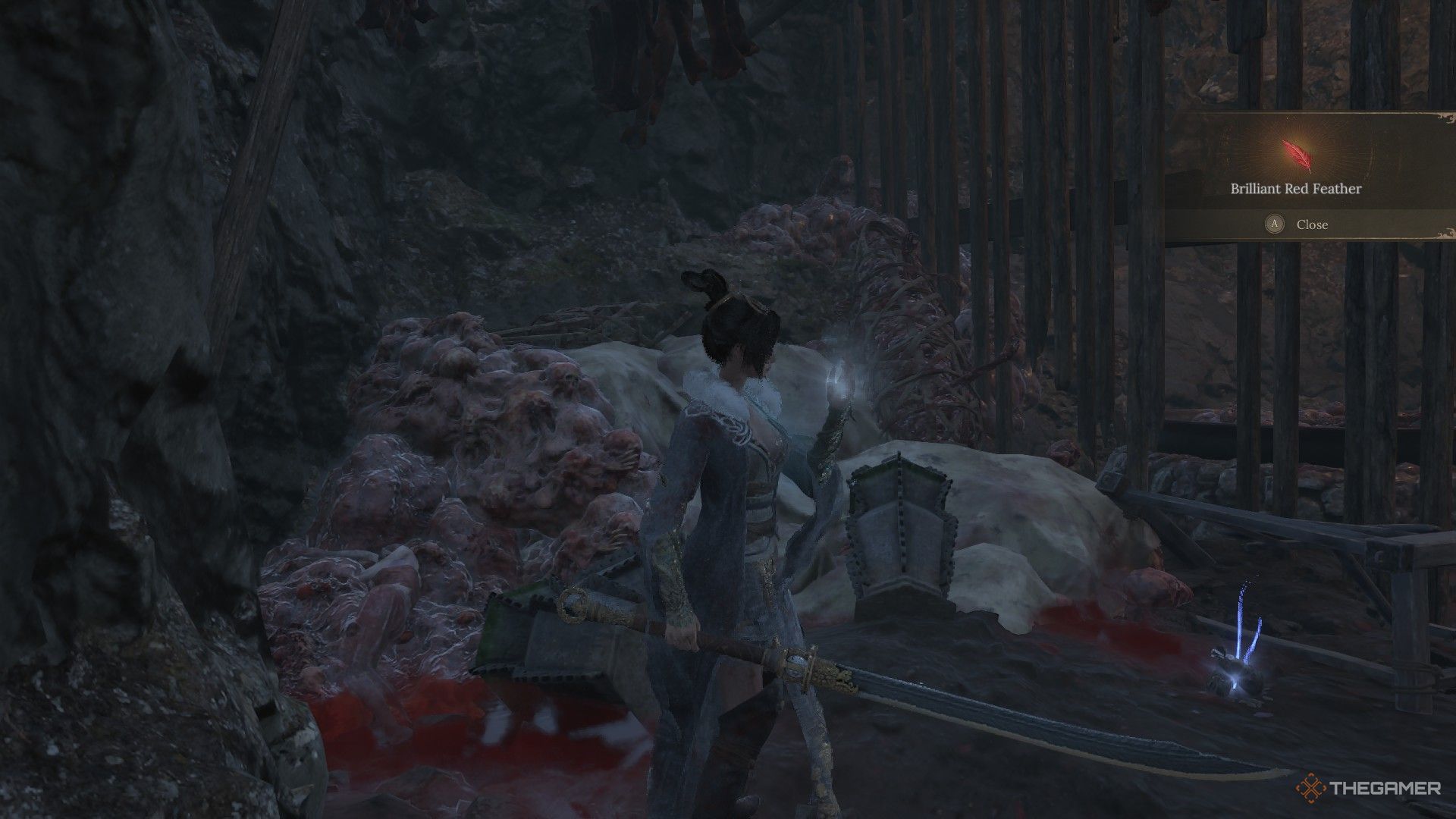 行くアッパービレッジから道を下っていますあなたが地獄の炎の呪文を獲得するために大きなトーチを含むミニボスと戦ったところ、あなたはかすかな赤い羽を見つけるでしょう交差点の地面にShu Sanctumのすぐ上ショートカットルートで。 |