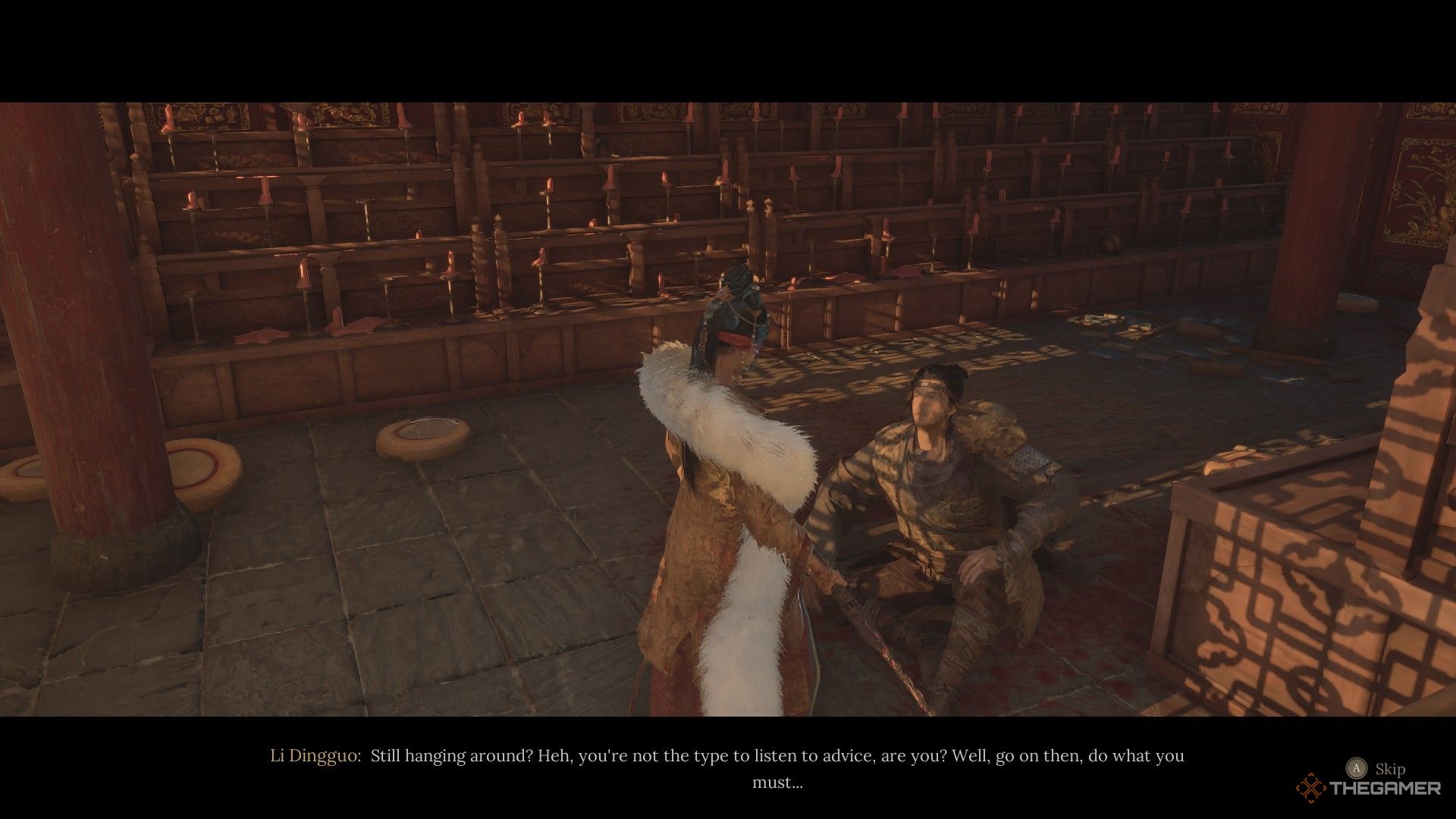 ライトツェン寺院からシューサンクムに向かう途中の門の横にあるキャンプファイヤー2人の敵に守られています。彼らの後ろの家で、かすかな赤い羽が座っています右側の部屋のテーブルの上。 |