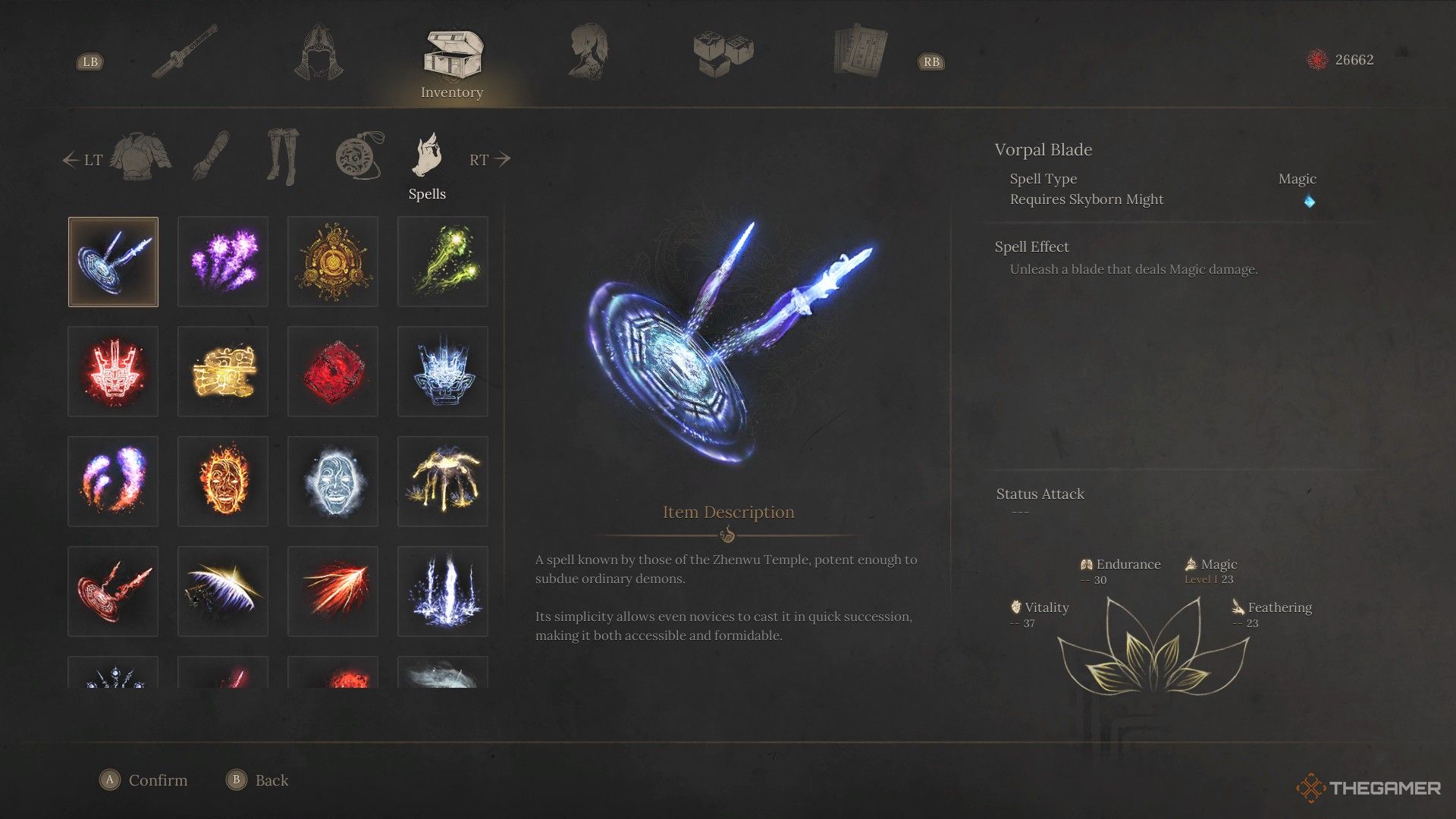 オーラムの羽の力 | 2 | 魔法 | Alacrityでバフされている間、魔法のダメージを与えて斜めの黄金の刃を前に発射します。 | 宮殿の丘の神社から、近くの階段を下って、この呪文を含む道の端にある死体まで行きます。 |
