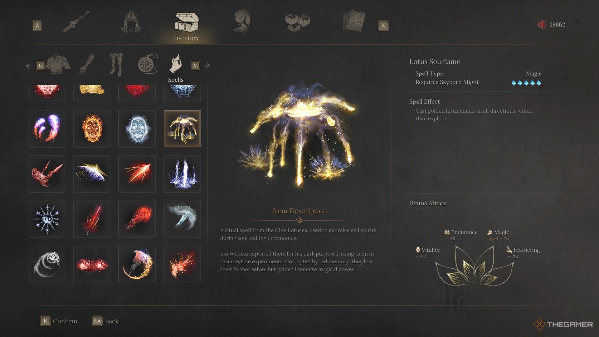 Lotus Soulflame | 5 | 魔法 | 短い充電の後、頭の上に蓮の花を作り、あなたの周りの弧で魔法を爆発させて雨を降らせます。 | バトルフィールドパスに到達した後、崩壊しつつある壁を通り抜けた直後に取ります。階段を取り、死体の背面の壁の上部に呪文を見つけます。 |