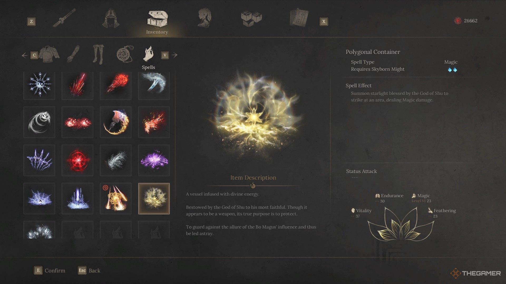 ゴールデンセプター | 3 | 魔法 | 火の発射体が2回前方に進むという黄金のオーブを作成します。 | 失われたボーキャピタルの深さが祝福のドアの後ろに残っているのと同じ部屋にあります。内部のストーリーテラーに相談し、彼のすべての対話を疲れさせてこの呪文を取得します。 |