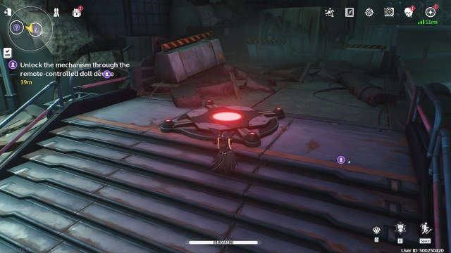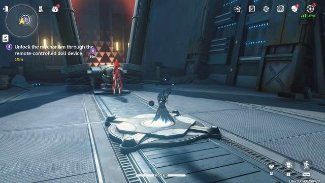 最初のパズルは最も簡単ですが、チュートリアルはそれをうまく説明していないので、私はそれがどのように機能したかについて少し混乱していました。初め、眼球のような形をしたマシンと対話します人形を操作します。これにより、インリンが戦闘中に使用する人形をコントロールするので、赤いボタンのプラットフォームに立ってください部屋の中央に。