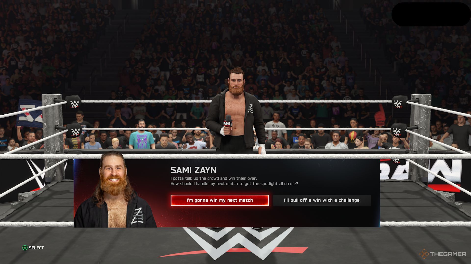 彼らがチャレンジ1を選ぶなら、彼らは課題を選択する必要があります彼らは引き受けたいと思っています。オプションはです5分で勝ち、かろうじて触れて勝ち、相手をタップアウトさせたり、スーパーフィニッシャーを引き離した後に勝ちます。次回レスラーが試合をするときは、課題が画面に表示されます。
