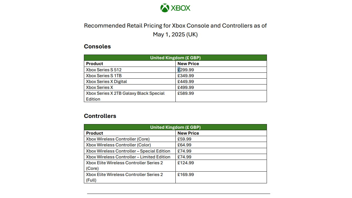 で5月1日の発表Microsoftは、ストレージやエディションに関係なく、XboxシリーズXおよびSコンソールの価格が上昇することを明らかにしました。シリーズXは100ドルから599.99ドル増加していますが、シリーズSの512GBバージョンは379.99ドルに増加します。これらの変更は世界中であり、シリーズXはそれぞれ英国とヨーロッパで20ポンドと50ユーロのジャンプをしています。他の国も、国によって異なる最新の推奨小売業者の価格設定を受け取ります。