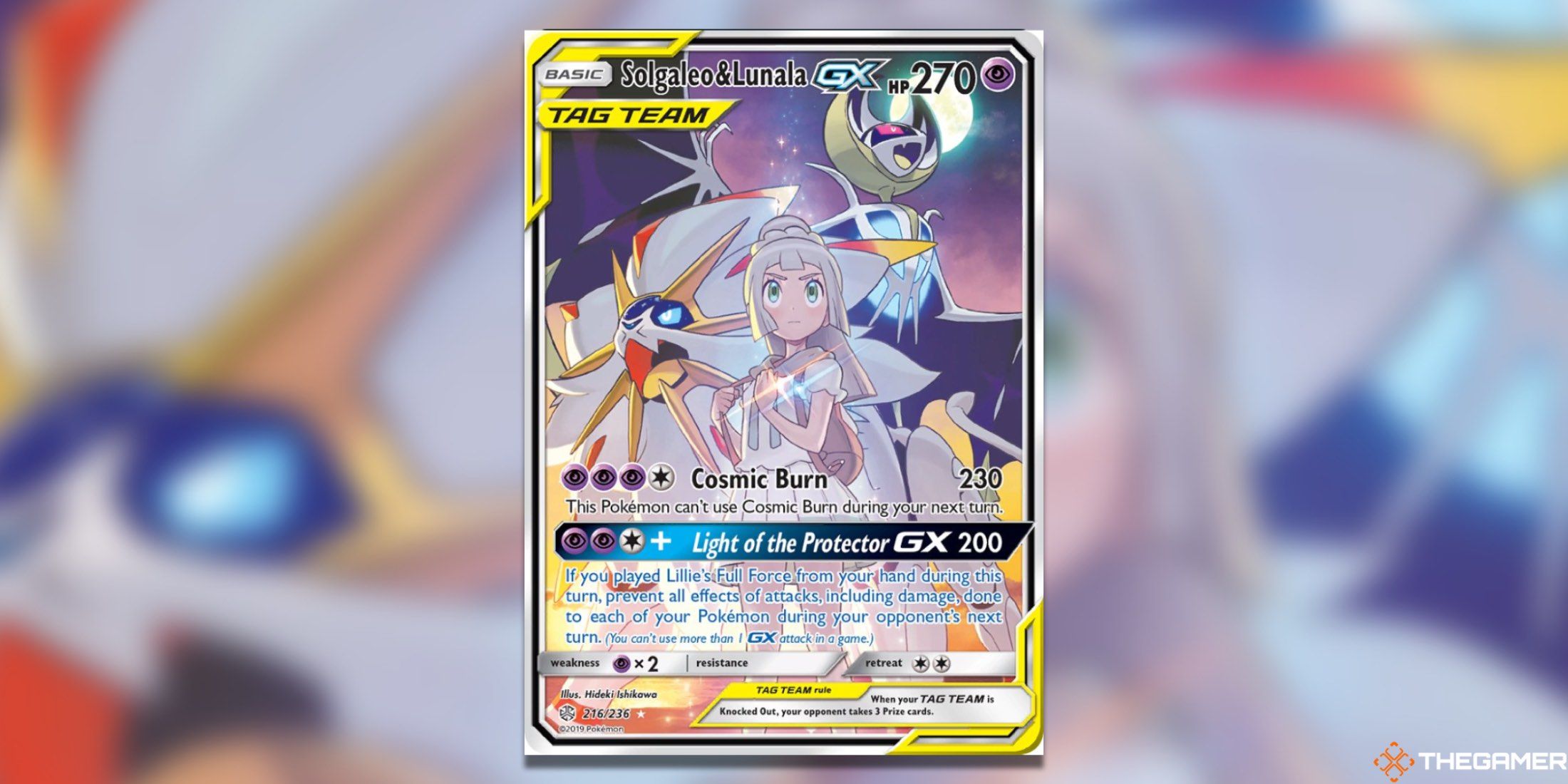 Solgaleo&Lunala GXは、この豪華なフルアートカードの背面に3つの科目を完全にバランスさせ、Lillieが2つのAlolan Box Legendary Pokemonの前で主導的な役割を果たします。このカードには太陽と月が組み合わされ、前者は底に輝き、後者は右上に輝きます。